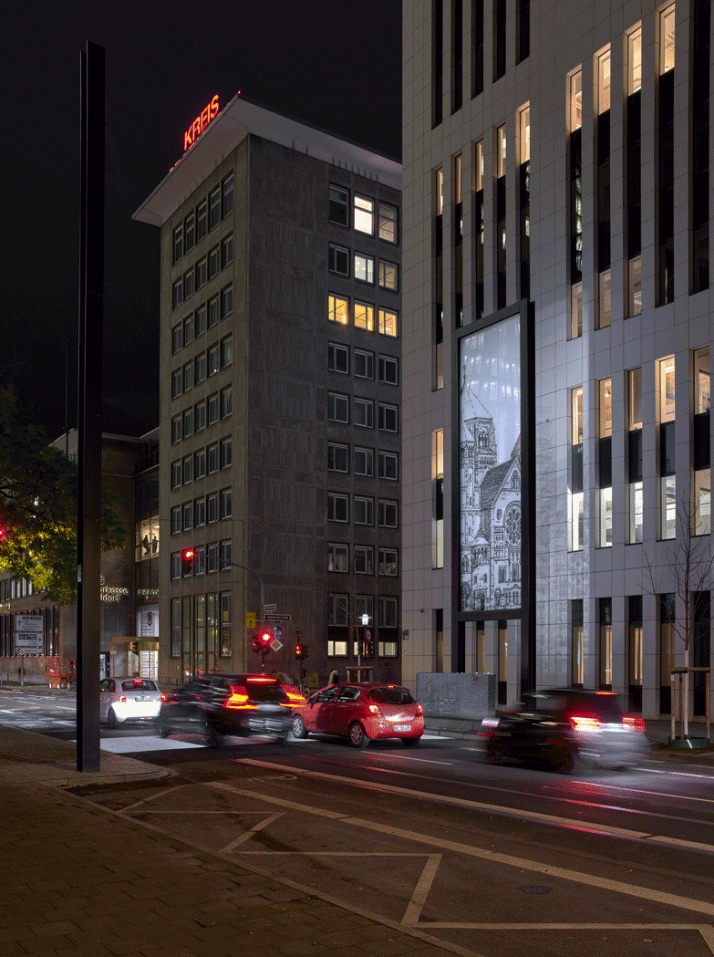 Mischa Kuball identifies a situation that often occurs but is rarely noticed in the urban environment of Graf-Adolf-Straße in Düsseldorf. Düsseldorf's central synagogue once stood on Kasernenstraße. During the November pogroms of 1938, it was set on fire on November 10 and finally demolished a few weeks later.